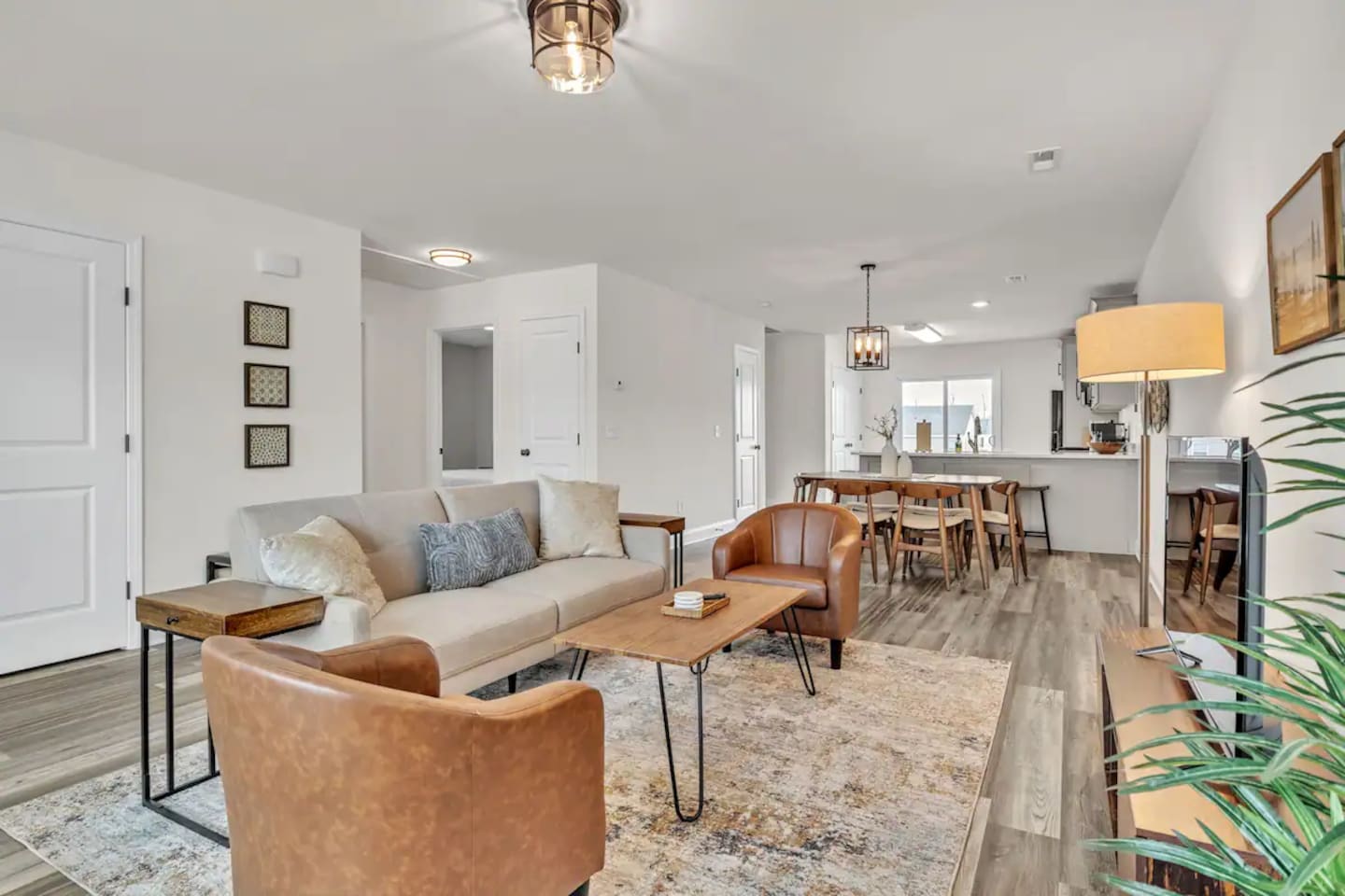 This is one side of a new-build duplex. The home has 2 bedrooms and 2.5 bathrooms and is located in a residential neighborhood. Enjoy a comfortable stay only 10 minutes from downtown Greenville. With a well-equipped kitchen, cozy living space, and comfortable beds, the property is perfect for work or relaxation and is thoughtfully designed for comfort in mind. After a day of exploring, relax on the back deck and listen to the sounds of the night.