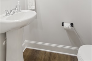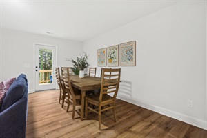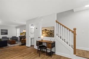 An open floorplan of the main level with plenty of comfortable seating and a large flat-screen Smart TV (no cable provided). This floor also has a half bathroom. A queen sleeper sofa in the living room offers extra sleeping space for guests. If you need to get some work done, there is also a dedicated desk and chair.
