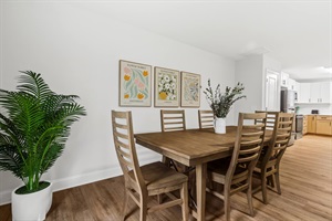 The fully stocked kitchen has everything you need to prepare delicious meals—refrigerator, stove, oven, microwave, dishwasher, and a coffee maker with coffee supplies. You'll also find pots, pans, dishes, cutlery, bakeware, and cooking essentials. There is also a dining table that comfortably seats six guests.