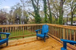 The unit has a private outdoor deck, separated from the adjacent unit by a privacy fence.